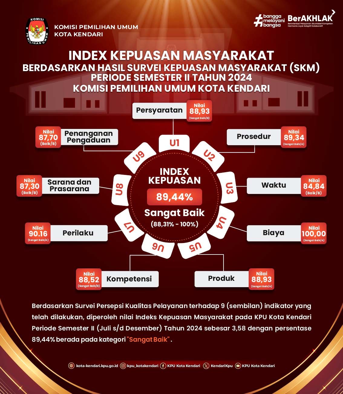 Berdasarkan Survei Persepsi Kualitas Pelayanan terhadap 9 (sembilan) indikator yang telah dilakukan, diperoleh nilai Indeks Kepuasan Masyarakat pada KPU Kota Kendari Periode Semester II (Juli s/d Desember) Tahun 2024 sebesar 3,58 dengan persentase 89,44% berada pada kategori "Sangat Baik" .
