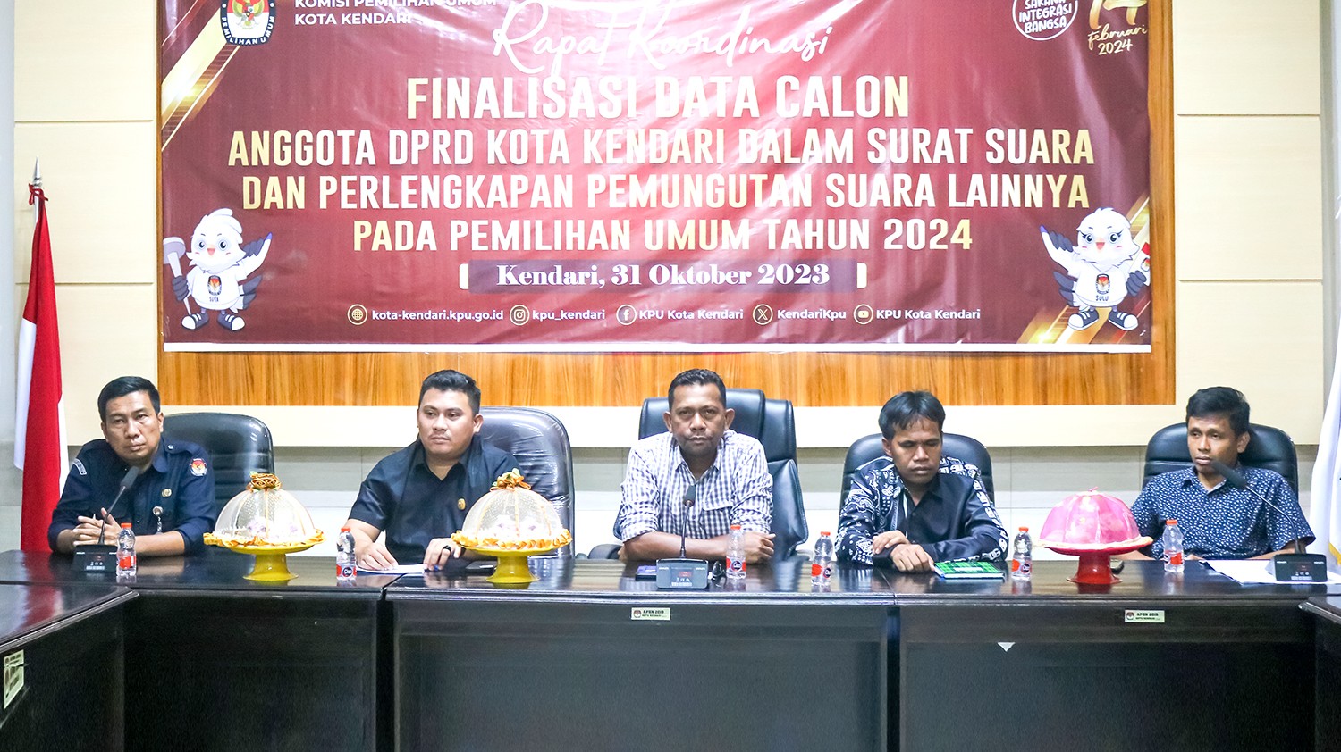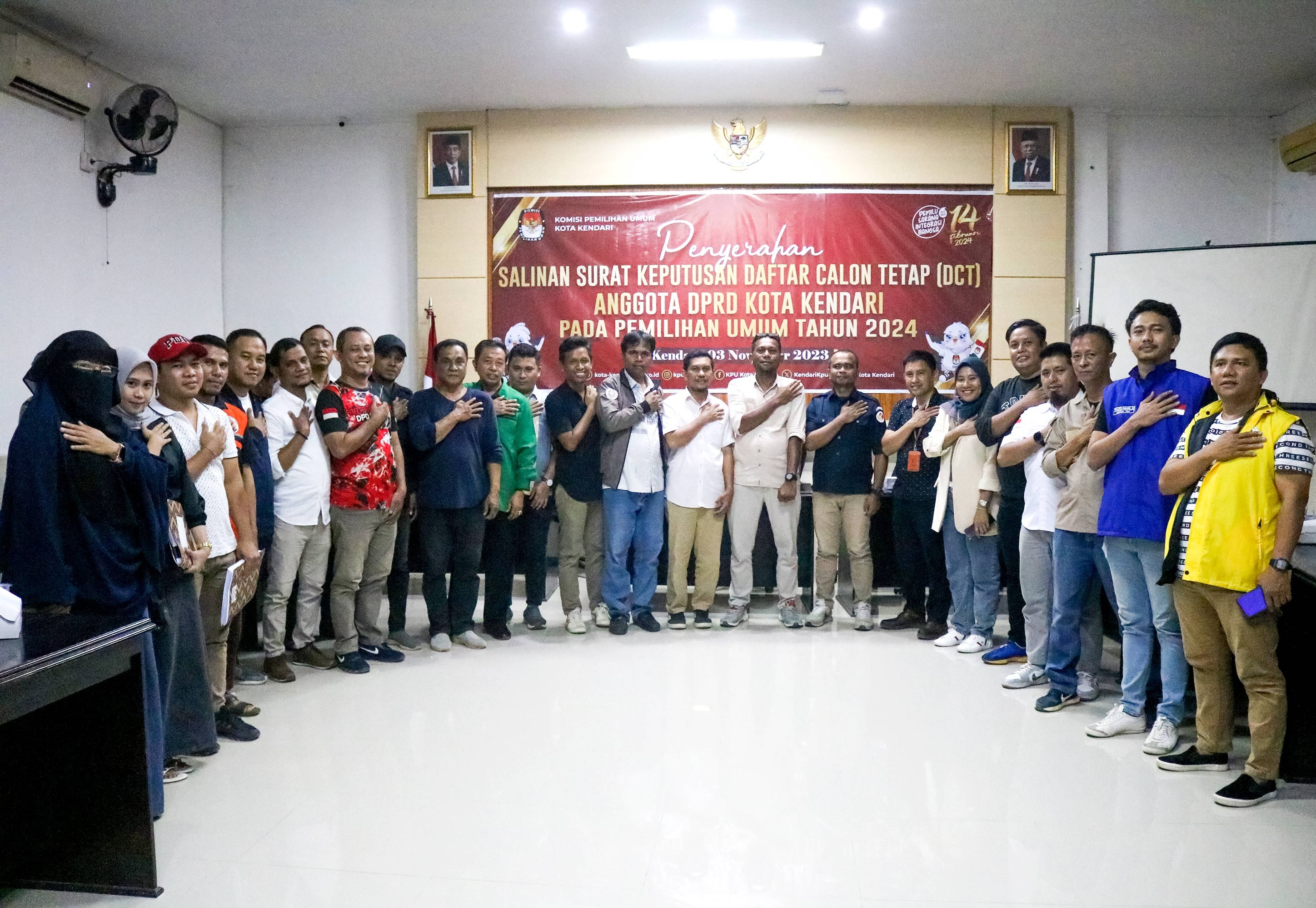 kota-kendari.kpu.go.id Kendari, 3 November 2023 Ketua dan Anggota KPU Kota Kendari, Jumwal Shaleh, La Ode Hermanto, Arwah, Hans A. Rompas dan Ahmad Segati Firihu, bersama Plt. Sekretaris KPU Kota Kendari, Muskam, menggelar kegiatan penyerahan Salinan Keputusan Daftar Calon Tetap (DCT) Anggota DPRD Kota Kendari pada Pemilu Tahun 2024 di Aula KPU Kota Kendari, Jumat ( 03/11/2023). Ketua KPU Kota Kendari, Jumwal Shaleh, menyampaikan bahwa kegiatan ini merupakan rangkaian dari tahapan pencalonan yang cukup panjang sehingga tiba pada hasil saat ini dan kemudian akan ditetapkan secara nasional pada tanggal 25 November mendatang. Jumwal juga berharap jika ada partai politik melakukan sosialisasi atau pendidikan politik dalam bentuk pertemuan tatap muka agar menyampaikan pemberitahuan kepada KPU, Bawaslu dan Kepolisian. Anggota KPU Kota Kendari, La Ode Hermanto menyampaikan bahwa terkait pemasangan iklan di papan public/kota-kendari/reklame oleh Bacaleg sebelum tahapan kampanye, KPU akan mengkoordinasikan kepada pemerintah daerah agar dapat diatur sesuai ketentuan perundang-undangan. Hadir dalam kegiatan ini, Ketua dan Anggota Bawaslu Kota Kendari, perwakilan Partai Politik tingkat Kota Kendari, perwakilan Polda Sulawesi Tenggara dan Perwakilan Polresta Kendari. (humasKPUKendari:Rh/foto:Dm)