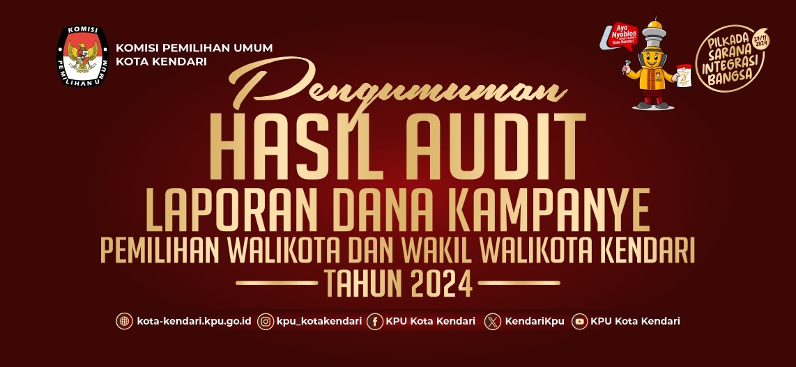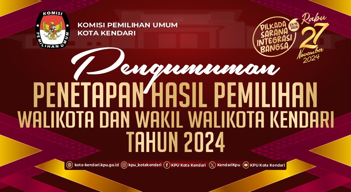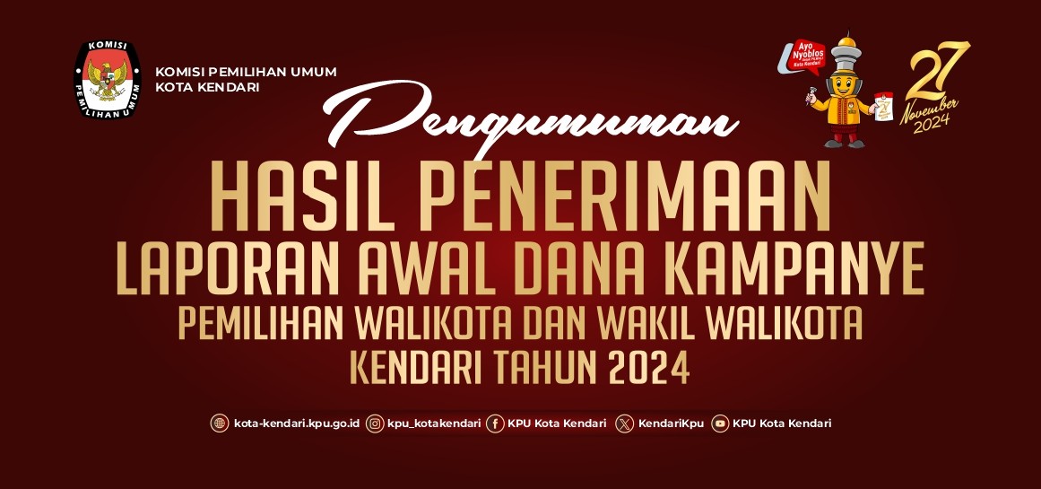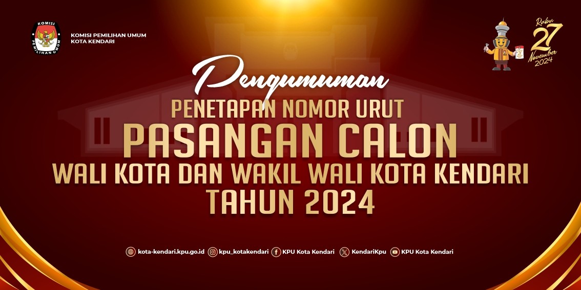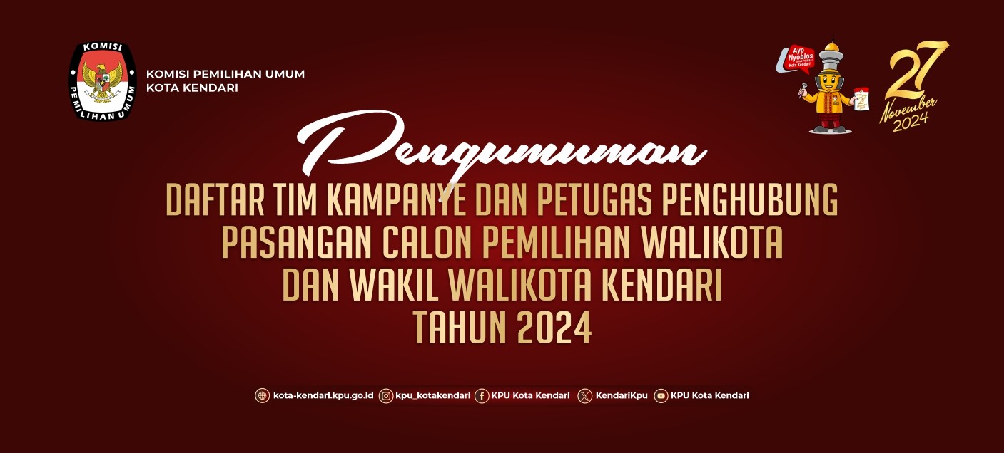Kendari, 24 September 2024, Bahwa dalam rangka melaksanakan ketentuan Pasal 8 Peraturan Komisi Pemilihan Umum Nomor 13 Tahun 2024 tentang Kampanye Pemilihan Gubemur dan Wakil Gubernur, Bupati dan Wakil Bupati serta Walikota dan Wakil Walikota dan Keputusan Komisi Pemilihan Umum Nomor 1363 Tahun 2024 tentang Pedoman Teknis Pelaksanaan Kampanye Pemilihan Gubemur dan Wakil Gubemur, Bupati dan Wakil Bupati, serta Walikota dan Wakil Walikota, maka dengan ini Komisi Pemilihan Umum KotaKendari mengumumkan Daftar Tim Kampanye serta Petugas Penghubung Pasangan Calon Walikotadan Wakil Walikota KendariNomor Urut 1 (Dr. Hj. Siska Karina Imran SKM dan Sudirman), Pasangan Calon Walikotadan Wakil WalikotaKendariNomor Urut 2 (Yudhianto Mahardika Anton Timbang, S.H dan Nirna Lachmuddin, S.Pd), PasanganCalon Walikotadan WakilWalikotaKendariNomor urut 3 (Sitya Giona Nur Alam dan H. Subhan S.T), PasanganCalonWalikotadanWakilWalikotaKendariNomor Urut 4 (Aksan Jaya Putra B.Bus dan Andi Sulolipu S,P), PasanganCa10nWalikotadan WakilWalikotaKendari Nomor urut 5 (Abdul Rasak S.P dan Jr. Afdhal, S.T., M.P.W.K), sebagaimana terlampir dalam pengumuman ini yang merupakan sebagai bagian yang tak terpisahkan dengan Pengumuman ini.