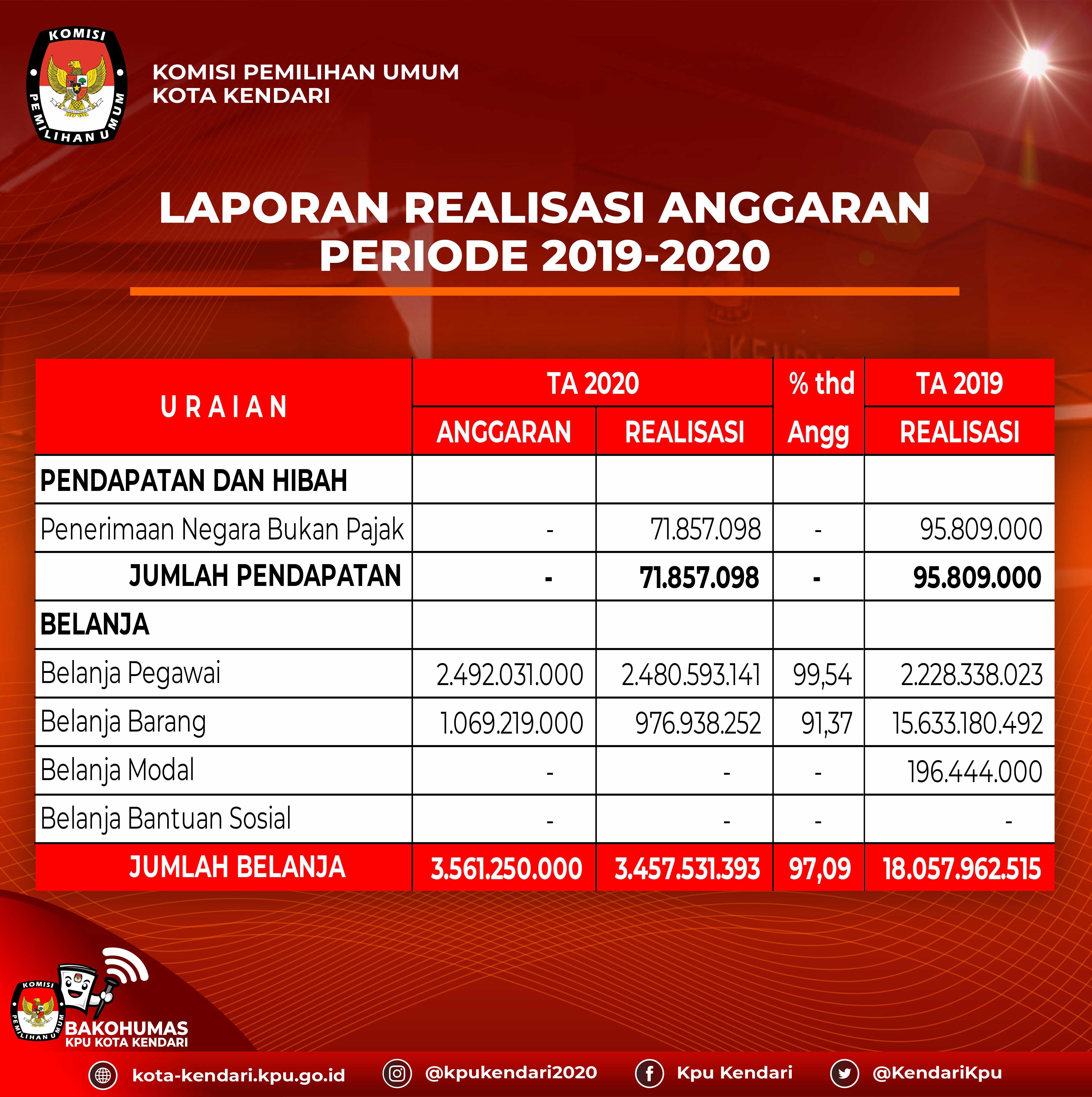 Laporan Keuangan ini diharapkan dapat memberikan informasi yang berguna kepada para pengguna laporan khususnya sebagai sarana untuk meningkatkan akuntabilitas / pertanggungjawaban dan transparansi pengelolaan keuangan negara pada Kantor KPU Kota Kendari. Disamping itu, laporan keuangan ini juga dimaksudkan untuk memberikan informasi kepada manajemen dalam pengambilan keputusan dalam usaha untuk mewujudkan tata kelola pemerintahan yang baik (good governance). Adapun Realisasi Anggaran KPU Kota Kendari Periode 2019-2020 digambarkan dalam bentuk gambar sebagai berikut