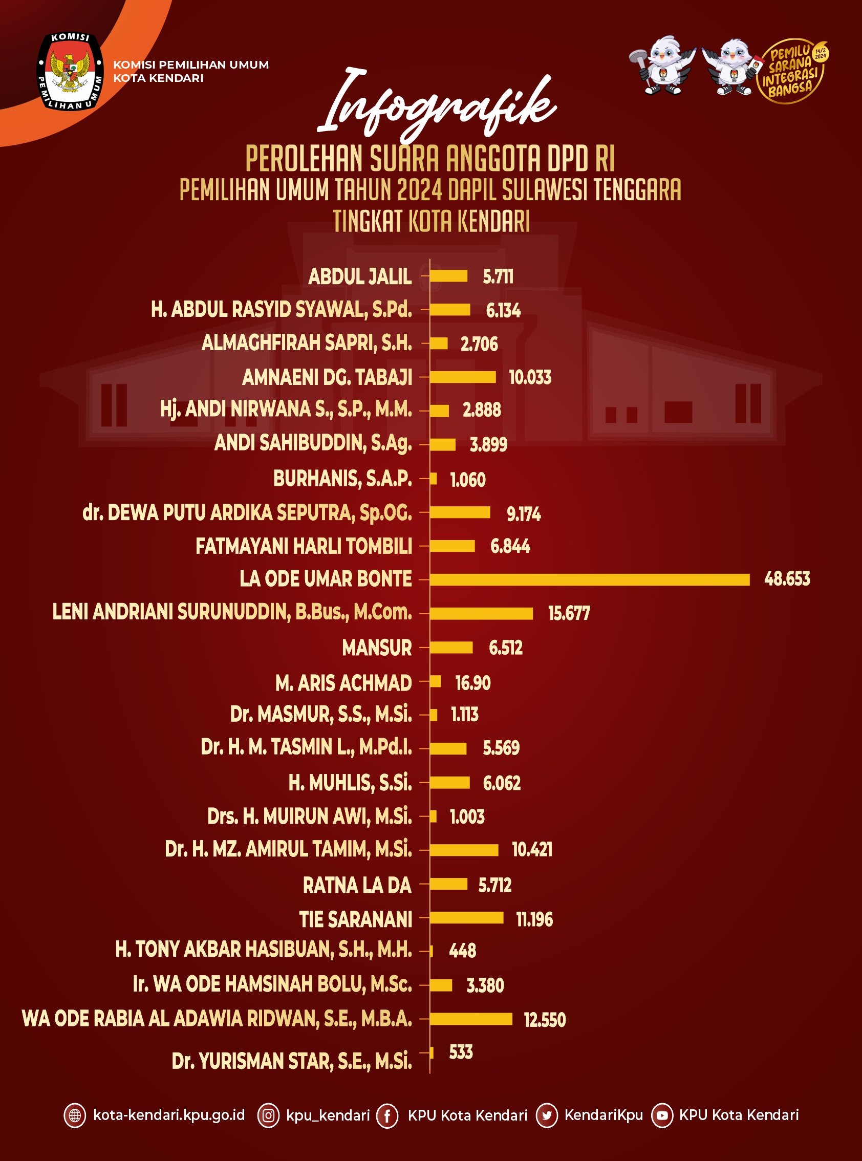 PEROLEHAN SUARA DEWAN PERWAKILAN DAERAH REPUBLIK INDONESIA DAPIL SULAWESI TENGGARA - KOTA KENDARI PEMILU 2024