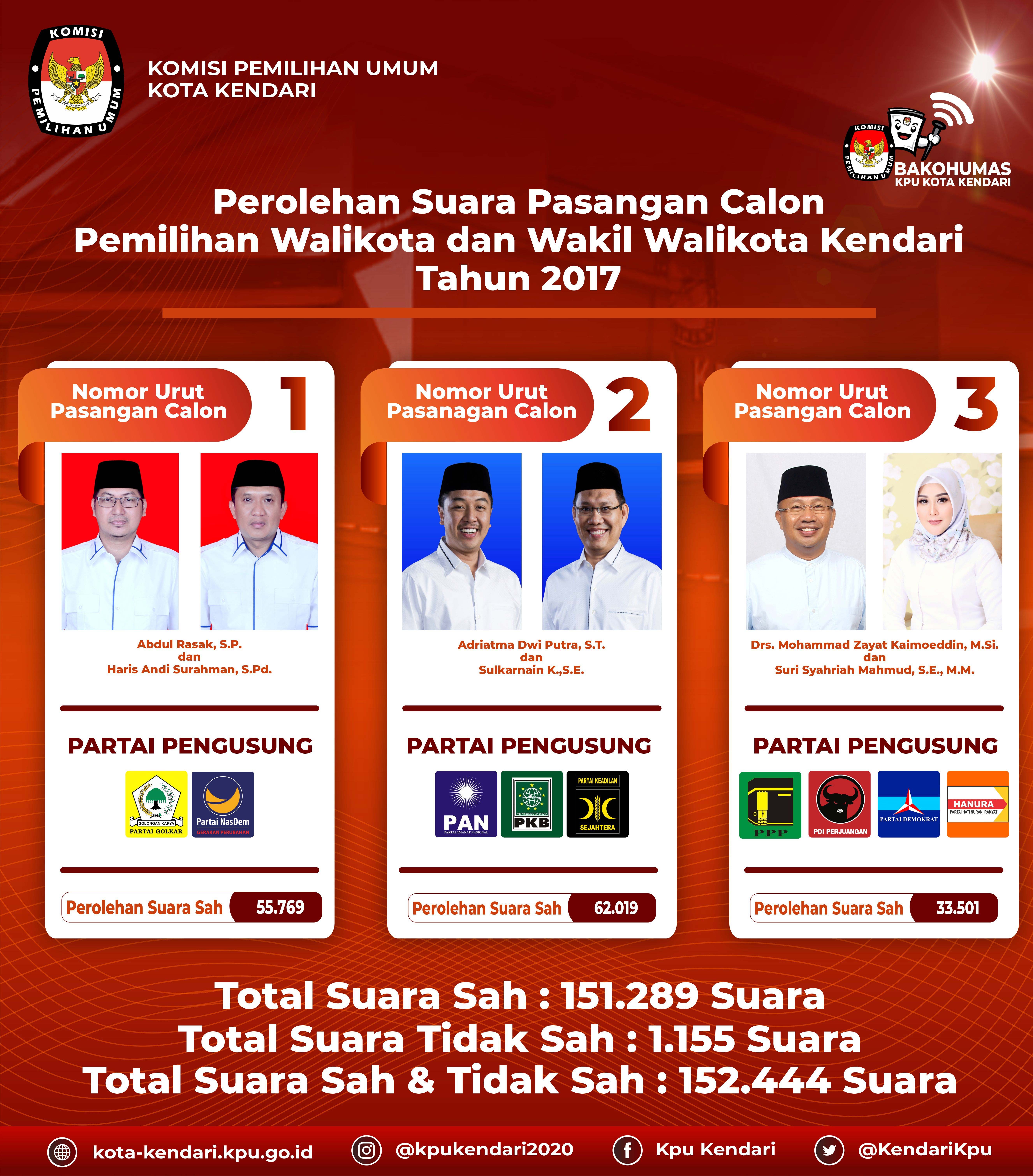Perolehan Suara Pasangan Calon Pemilihan Walikota dan Wakil Walikota Kendari Tahun 2017 Keputusan Penetapan Hasil dapat diunduh disini Share this artikel : Dilihat 573 Kali.