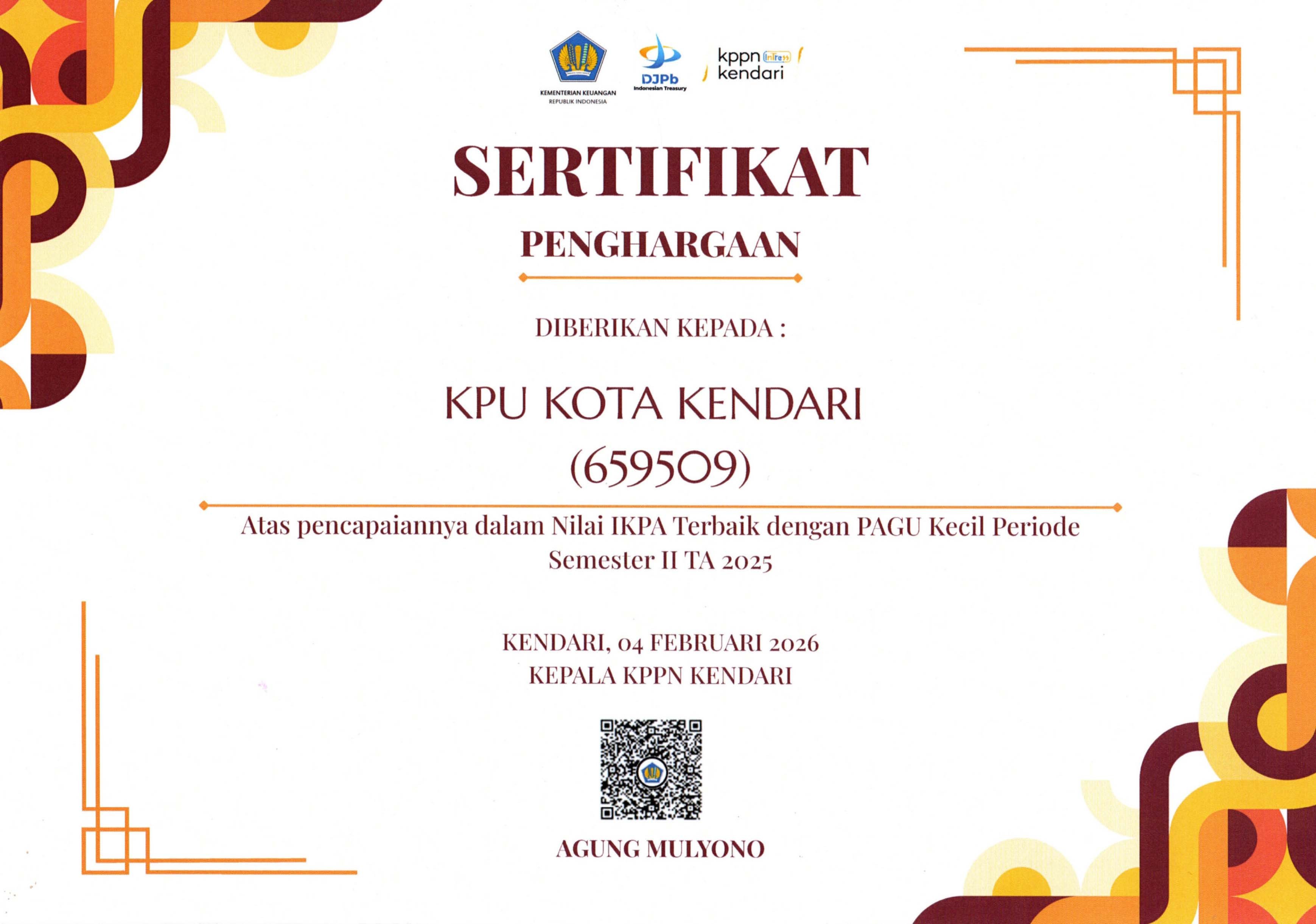 Sertifikat Penghargaan Atas Nilai IKPA Terbaik dengan PAGU Kecil Periode Semester II TA 2023